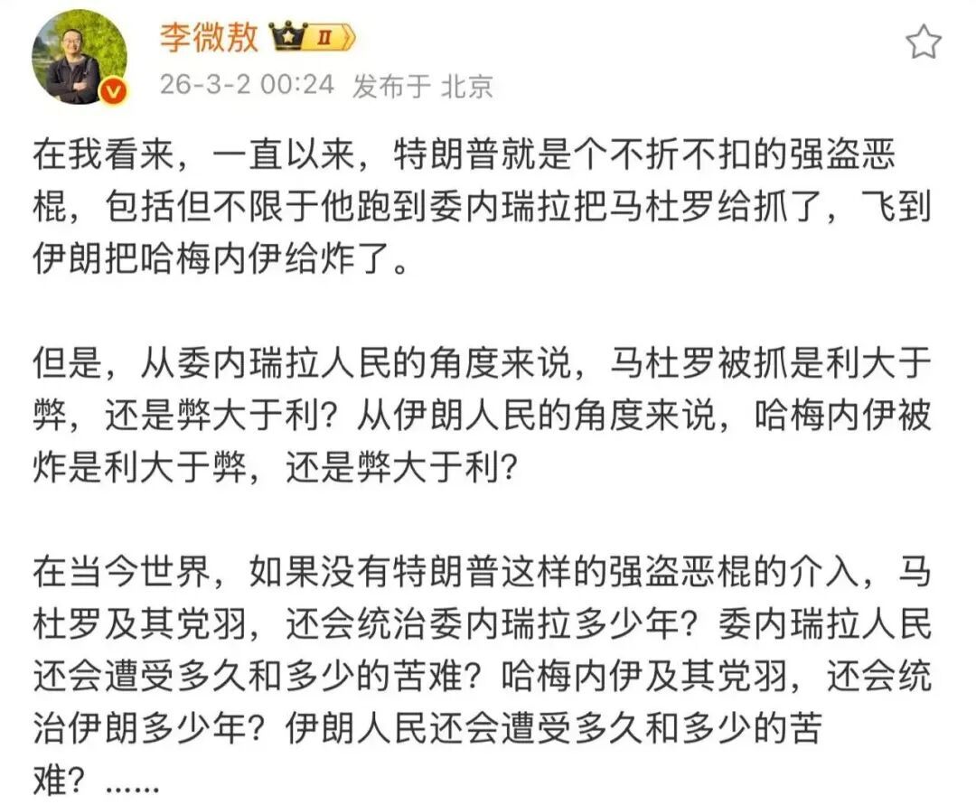 记者李微敖发了一则帖子,大意是特朗普是不折不扣的强盗恶棍,但无论是委内瑞拉的马杜罗还是伊朗的哈梅内伊,他们的死亡和被捕,对老百姓的利弊其实每个人都看的清清楚楚。