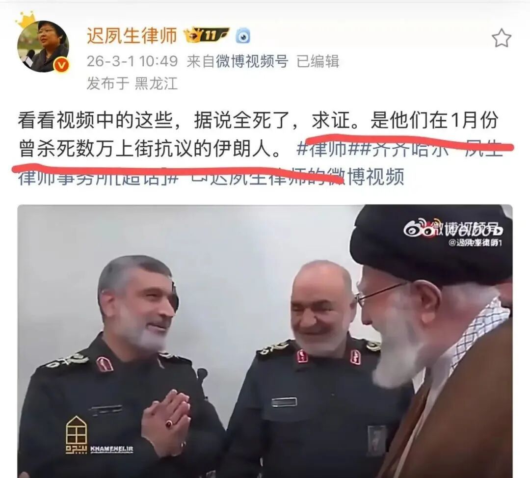 对内,一贯暴力镇压。东北的一位女律师今天转发了一则视频,大意是1月份曾杀死数万上街抗议伊朗人的这些人物,现在都没了。