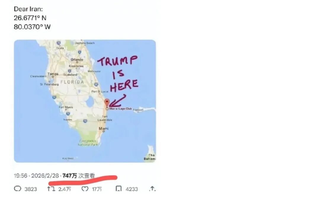 三是,哈梅内伊被炸死,很多人说是因为内奸提供了位置,那么OK,美国人在网上给伊朗发布了特朗普的定位,已经747万观看,17万点赞了,那么这按照国内某些人的逻辑是不是最大的内奸,但遗憾的是这则定位图现在还在网络继续传播着,没有被404,也没有被美国人骂,而伊朗军队也没有顺着定位发射导弹过去。